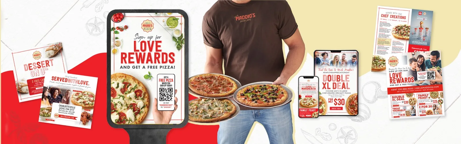 Full-service marketing for Uncle Maddio's Pizza - digital campaigns, promotional flyers, in-store posters, outdoor signage, and a loyalty rewards program, all tied together under one consistent brand experience.